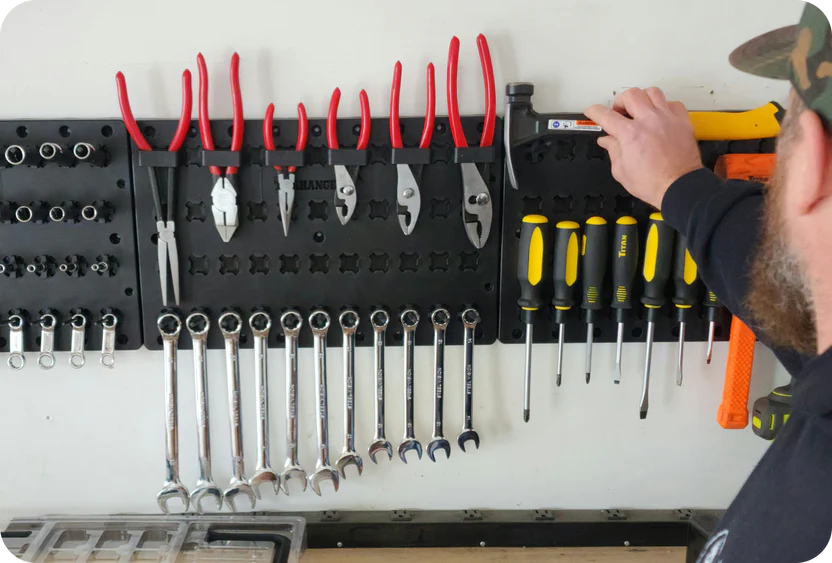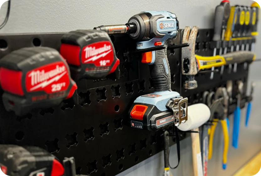 Build your wall your way. ToolHanger pieces connect and expand so you can create a layout that fits your tools, your space, and how you actually work. No wasted wall space—just a clean, intentional setup.